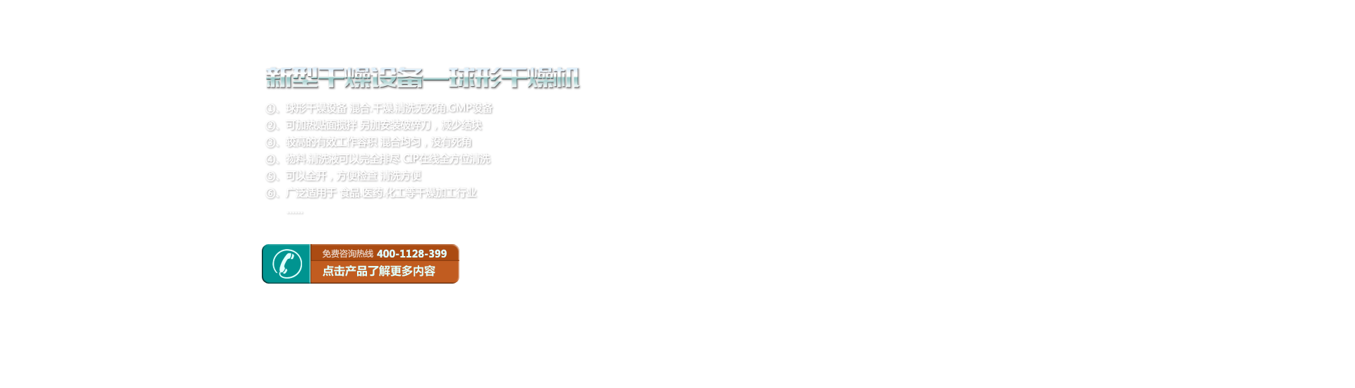 球形干燥機:因其形狀類似于球體而得名,球形干燥器、球型干燥機是目前干燥設備上比較新穎的一種,不但可以用于干燥,還可以用于混合,制粒等。與其他干燥設備相比,其具有物料適用性強,裝料系數(shù)高,干燥效果好,混合無死角,下料無殘留,易于清洗,符合cGMP要求等優(yōu)點,但由于其技術要求高,加工難度較大,導致其售價較高,目前在國內(nèi)應用較少。